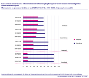 Según un estudio realizado por el Observatorio Social de la Fundación la Caixa, en España sigue habiendo un problema a la hora de atraer el talento joven femenino al ámbito de las STEM. Los datos reflejan que muy pocas adolescentes, el 0,7%, están interesadas en estudiar un grado relacionado con las tecnologías digitales, frente al 7% de los hombres.